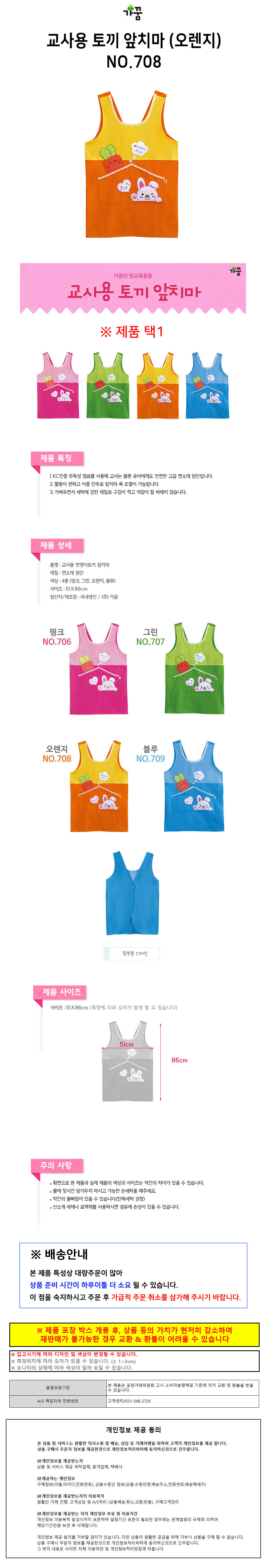 가꿈 선생님앞치마 교사용 토끼 앞치마 (오렌지) (NO.708) 유치원 어린이집