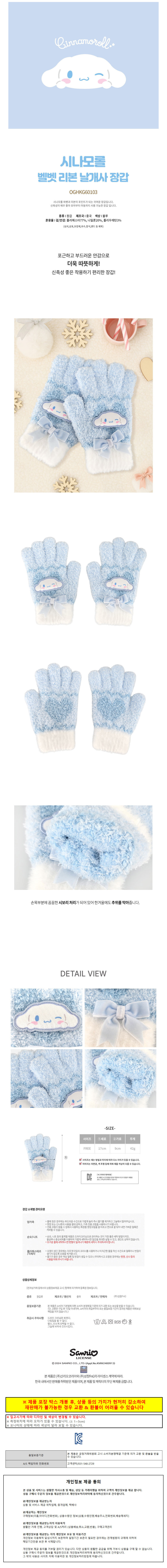 성창 방한장갑 시나모롤 벨벳 리본 날개사 장갑  아동 어린이 예쁜장갑