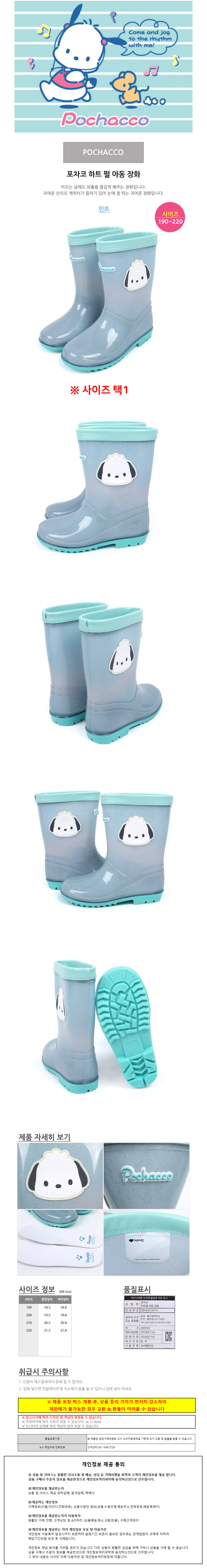 성창 아동장화 포차코 하트펄 아동 레인부츠 (택1) 어린이 캐릭터 장화