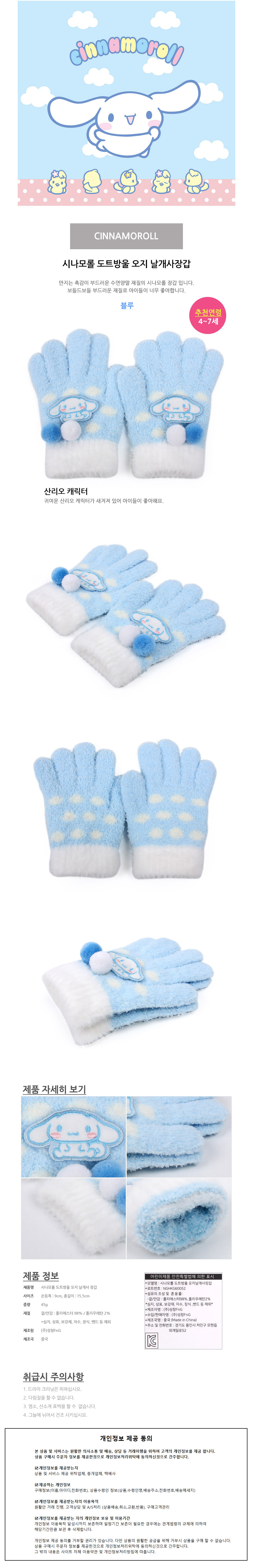 성창 장갑 시나모롤 도트방울 오지 날개사 아동장갑 방한장갑
