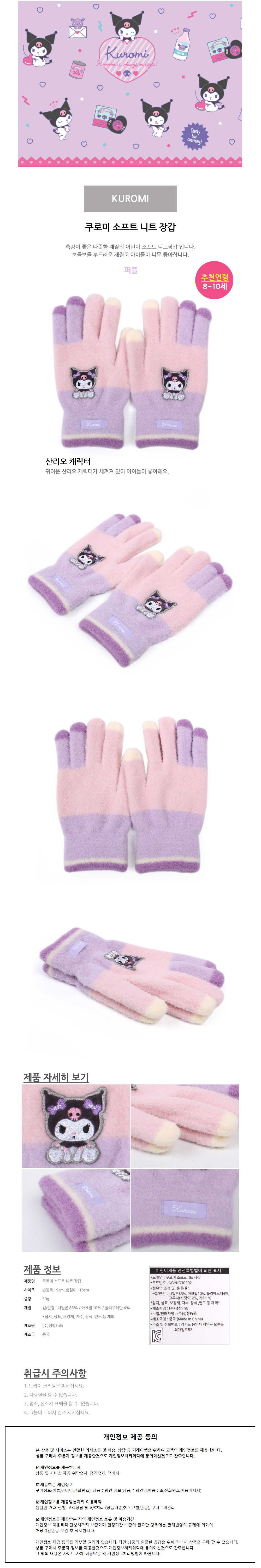 성창 장갑 쿠로미 소프트 니트 아동장갑 방한장갑