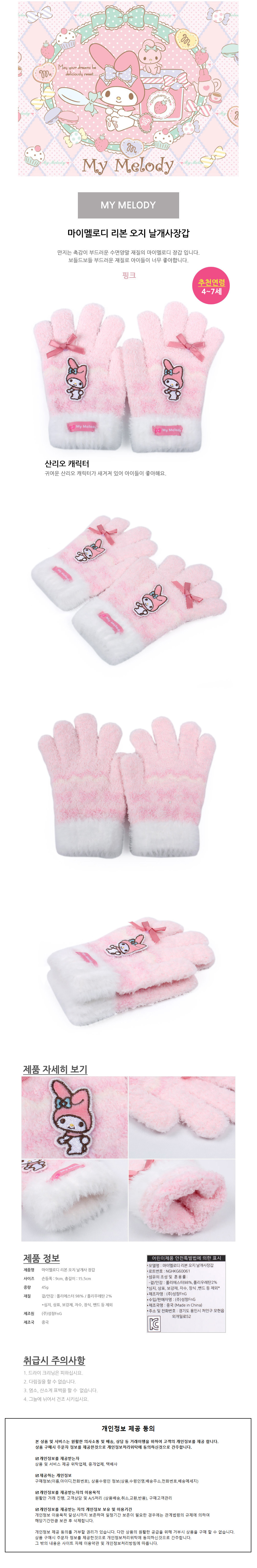성창 장갑 마이멜로디 리본 오지 날개사 아동장갑 방한장갑