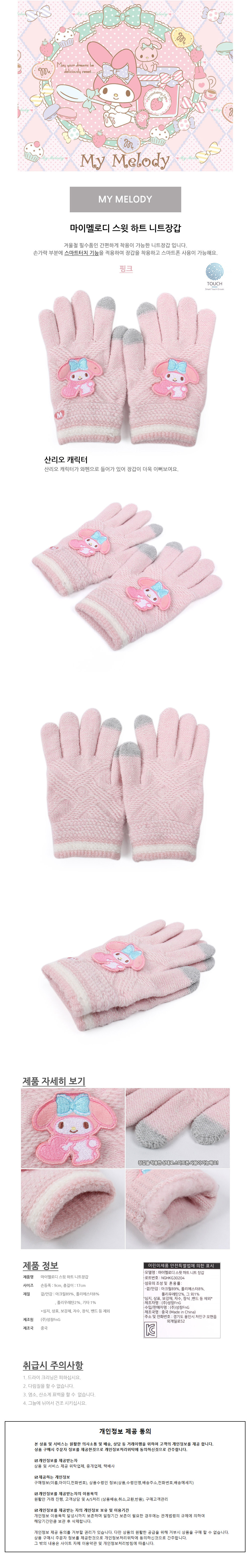 성창 장갑 마이멜로디 스윗하트 니트 아동장갑 방한장갑