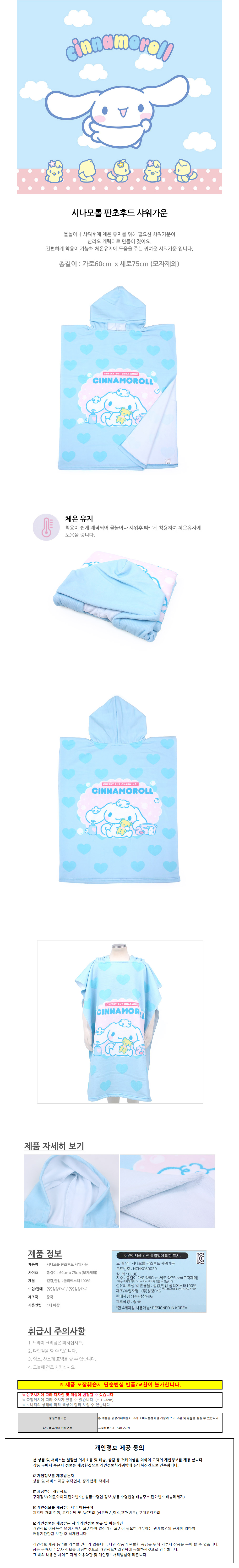 성창 바스타월 수영타올 시나모롤 판초타월 후드 샤워 가운 목욕가운