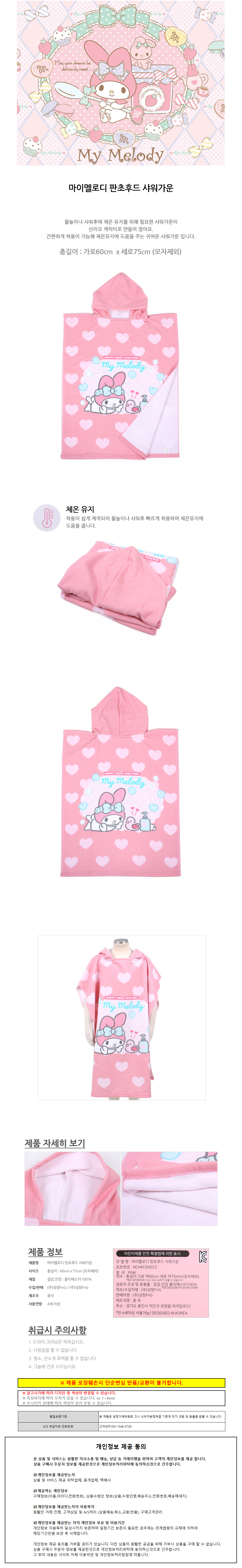 성창 바스타월 수영타올 마이멜로디 판초타월 후드 샤워 가운 목욕가운