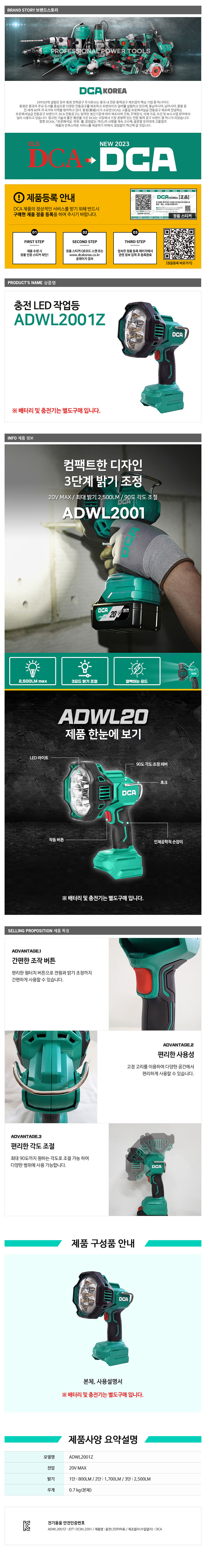 DCA ADWL2001Z 충전 LED 작업등 20V 베어툴 2500루멘