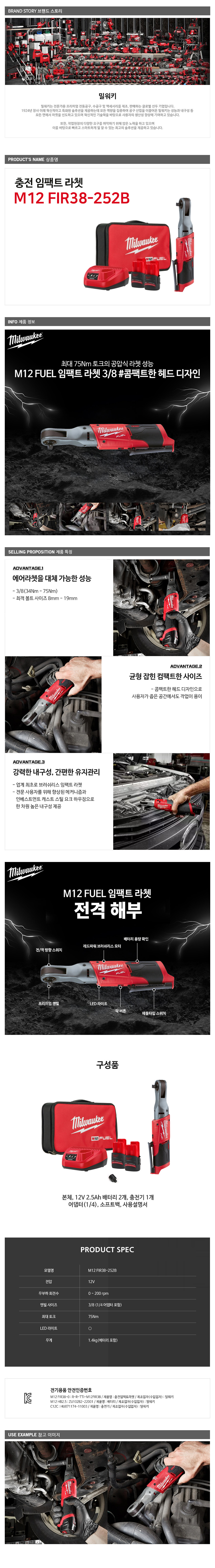 밀워키 M12 FIR38-252B 충전임팩라쳇렌치 12V 2.5AH