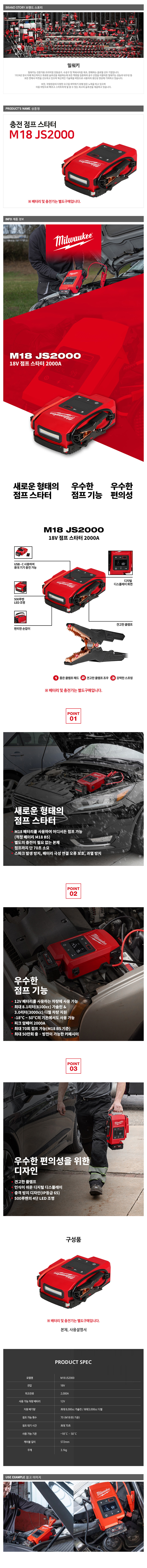 밀워키 M18 JS2000-0 충전 점프스타터 18V 베어툴